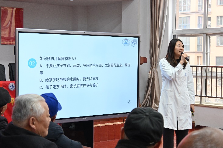 最后为确保落实科普知识宣讲活动效果,提高社区老人健康科学素养,讲座结束后,团队成员开展“急救知识有奖趣味竞答”环节,社区老人积极互动参与,团队成员为答对题目的居民分发小礼品,现场气氛活跃。