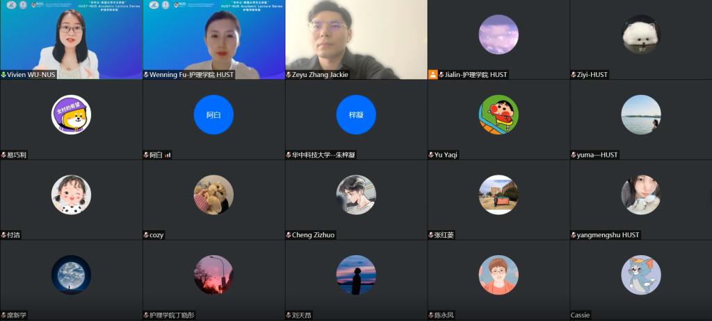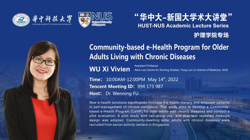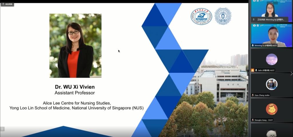 5月14日上午,“华中大-新国大学术大讲堂”太阳集团网站8722专场顺利举行。本次讲座围绕主题“针对慢性病老年人的社区电子健康计划:一个创新项目的开发和试点评估”,邀请新加坡国立大学杨潞龄医学院李陈爱礼护理学中心吴曦助理教授作专题报告。讲座由我校太阳集团网站8722付文宁讲师主持,通过腾讯会议在线直播,来自清华大学、武汉大学、新加坡国立大学等国内外高校及附属医院50余人线上参会。