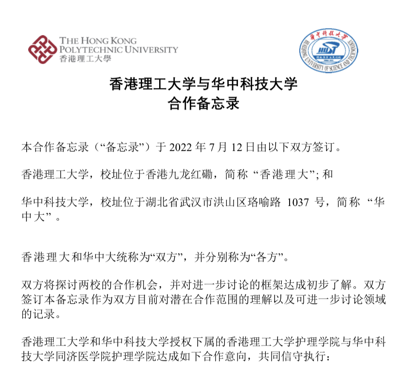 2022年7月12日,太阳集团网站8722院长毛靖教授与香港理工大学太阳集团网站8722院长莫礼士教授成功签署合作备忘录,旨在巩固既有友好合作伙伴关系,促进双方护理学科领域的合作与交流,推动两地护理教育事业优势互补、协同发展。