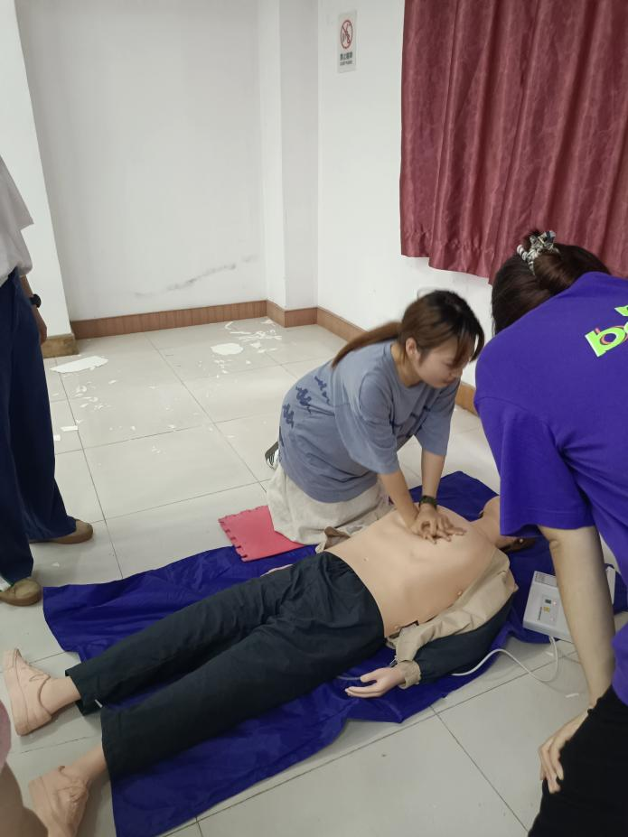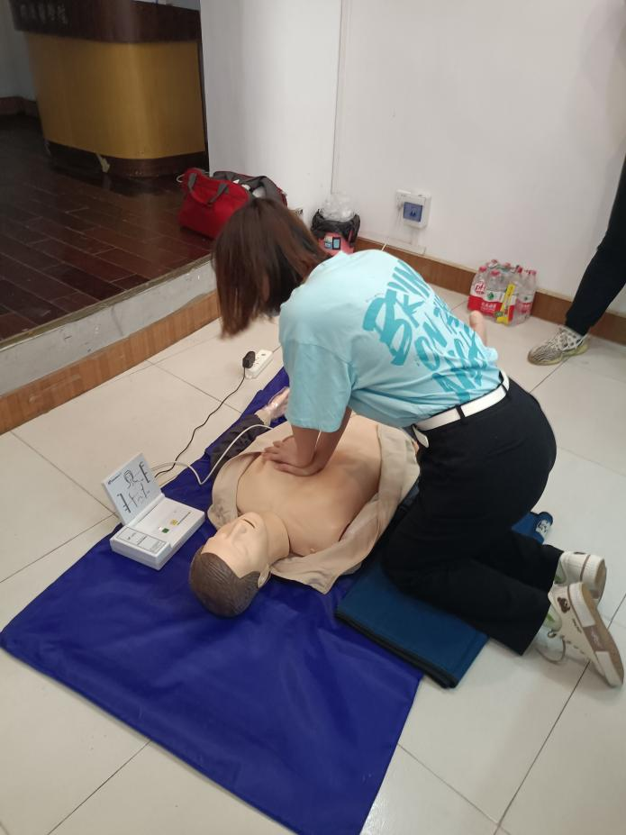 本次培训的最后一项内容是现场考核,即培训的成果验收。同学们依次尝试,在老师的指导下规范了体位,较好地控制了按压深度、按压频率,最终顺利通过了实践考核。