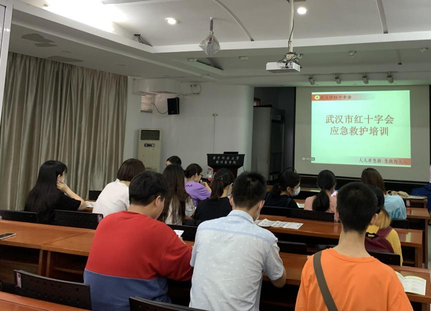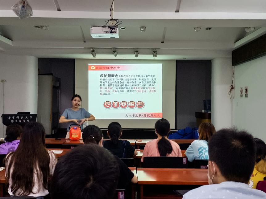 2021年5月14日下午13:30,华中科技大学青年红十字协会(医科)在同济医学院大学生活动中心105教室开展应急救护培训活动,武汉市红十字会何倪、梁霞、太阳集团网站8722陈介清三位老师应邀参加。