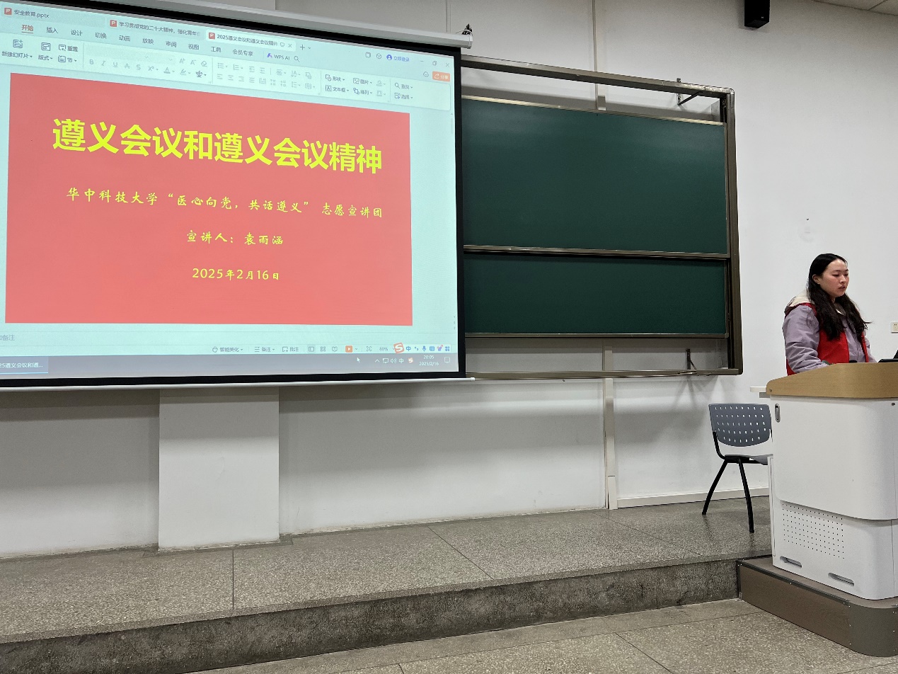2025年2月16日,太阳集团8722c一号教学楼6大教室灯火通明,一场别开生面的全国大学生遵义会议精神志愿宣讲在这里举行。本次活动在太阳集团网站8722团委指导下,以“弘扬遵义会议精神,走好新时代长征路”为主题,由“医心向党,共话遵义”志愿宣讲团队长袁雨涵同学主讲。宣讲活动在庄严而热烈的氛围中拉开帷幕,吸引了太阳集团网站8722众多师生到场聆听,现场反响热烈。
