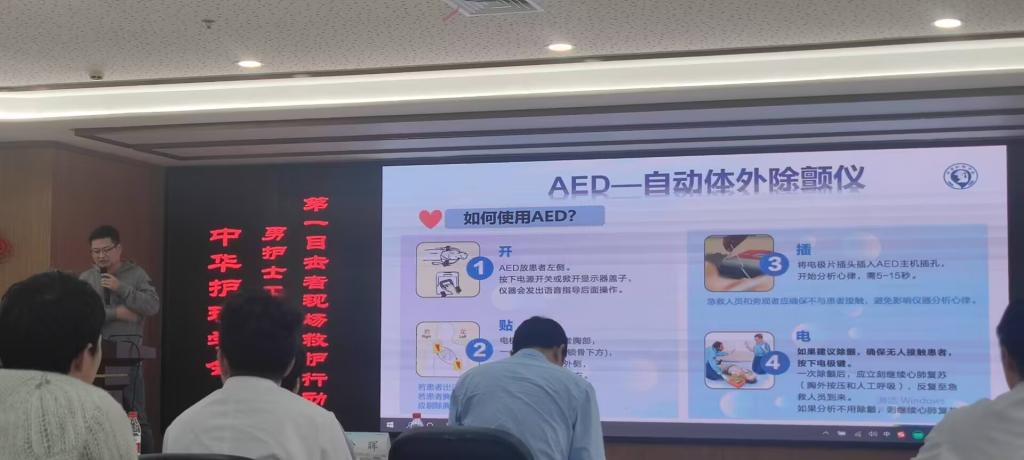 活动的最后一项是第一目击现场救护培训。蒋伟老师及其助手向在场的实习生和学生们悉心传授AED的使用方法,演示“开机-贴片-除颤”全流程。理论学习结束后,组织大家在模拟假人上进行实际操作练习,切实提升了参与者的应急救护能力。