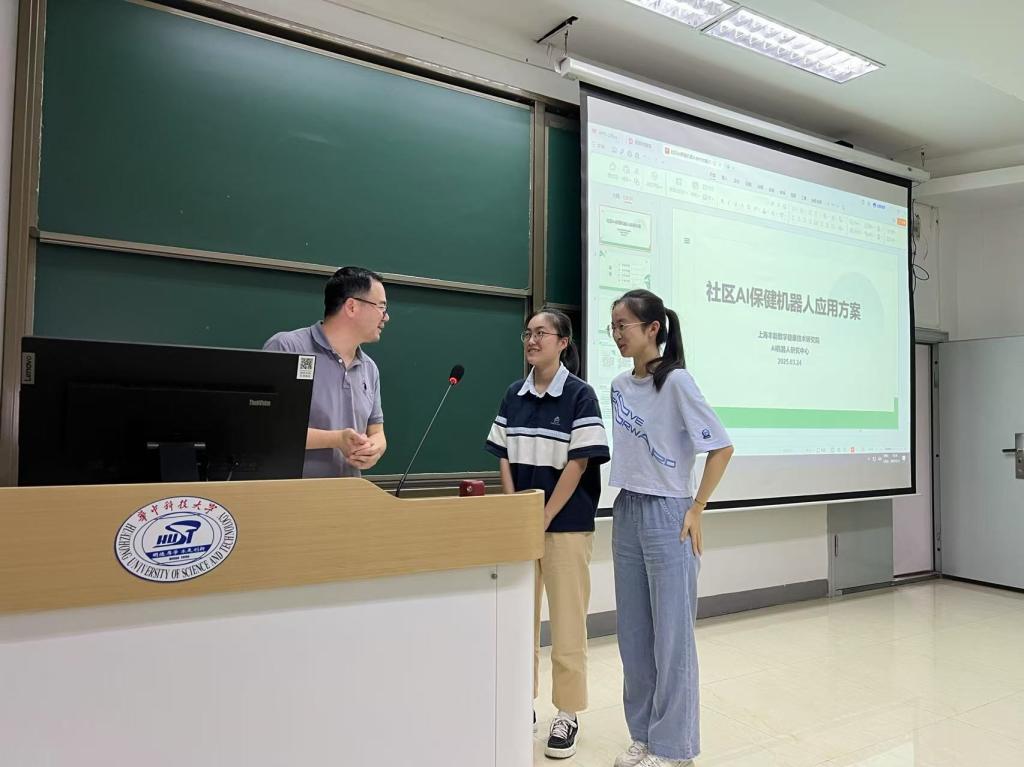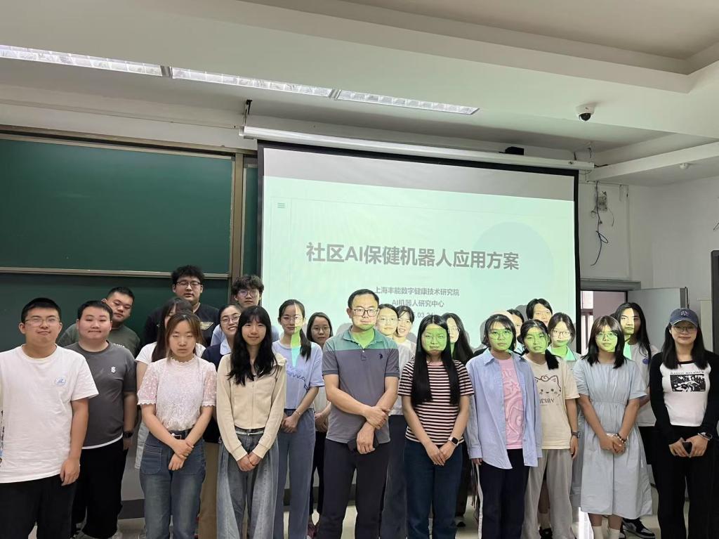 胡朝阳校友深耕社区嵌入式"邻里守护"老年人医养结合领域多年,在上海、浙江等地的创新实践成果丰硕。分享会上,他系统阐释了AI康养机器人在社区场景的全流程应用方案,详细展示了其主导研发的智能康养设备在技术创新、功能拓展及服务模式上的突破性成果。同时,通过详实数据和典型案例,深入浅出地解读了我国老龄化现状与社区康养产业趋势,为学生打开了一扇洞悉行业发展的窗口。胡朝阳校友还特别结合实际项目,揭秘了AI康养机器人商业化落地过程中,通过合伙人机制实现技术成果转化的创新模式。