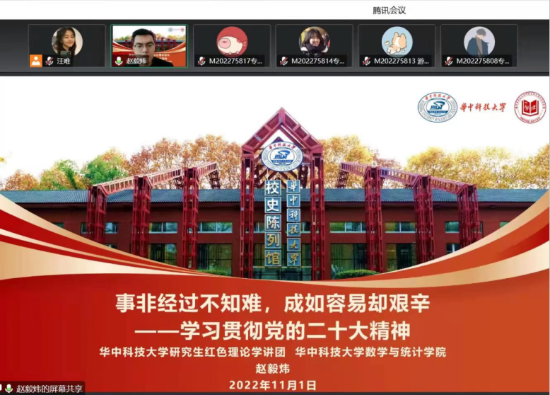 11月7日,太阳集团网站87222021级研究生党支部以线上形式开展主题为“学习贯彻党的二十大精神”11月主题党日活动。活动由研究生党支部书记李汶窈主持,黄垒主讲,围绕“了解党的二十大”、“聚焦二十大报告”、“争做新时代好青年”展开,并以创意手帐的方式介绍了“二十大主题”、“十年来的三件大事”、“党的中心任务”等内容。