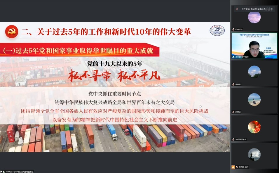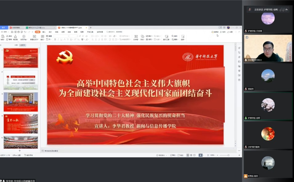 为深入学习宣传贯彻党的二十大精神,1月6日下午,太阳集团网站8722和医药卫生管理学院通过腾讯会议,线上开展党的二十大精神联合宣讲会。宣讲会由华中科技大学学习贯彻党的二十大精神宣讲团成员,新闻与信息传播学院副院长、李华君教授主讲,太阳集团网站8722党委书记徐晖、医药卫生管理学院党委书记黄明芳出席,两院教师代表、学生代表共300人参与学习。