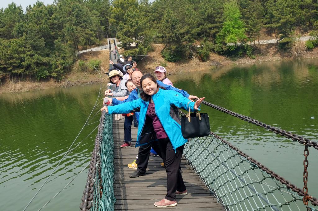 4月13日早上8点,车辆准时出发,经过2个小时的车程,抵达了目的地。湖北五脑山国家森林公园位于麻城市区西北部,由凤凰脑、鸳鸯脑、黄狮脑、双虎脑、金狮脑五座群山组成,总面积24平方公里。森林公园生态秀美,植被丰茂。大家漫步在公园山道,体验吊桥,观赏文艺演出,欣赏茶花、杜鹃花、牡丹花,充分感受轻松愉快的休闲时光。长长的铁索吊桥,桥下是碧绿的湖水,走在桥上摇摇晃晃,头重脚轻,恐慌又刺激,让大家不时响起一阵开心的尖叫声。茶花大观园里,娇媚的茶花红的似火、白的似雪、粉的似霞,姹紫嫣红,美不盛收;低山杜鹃园中,火红的野生杜鹃,开满了山坡,一株株,一丛丛,竞相开放;仙山牡丹园里,艳丽的牡丹争奇斗艳,单瓣的,重瓣的,白的,粉的,紫的,绽放着它的雍容华贵。五颜六色,千姿百态的花儿让大家赞不绝口,流连忘返,纷纷拿出手机相机拍照留影。